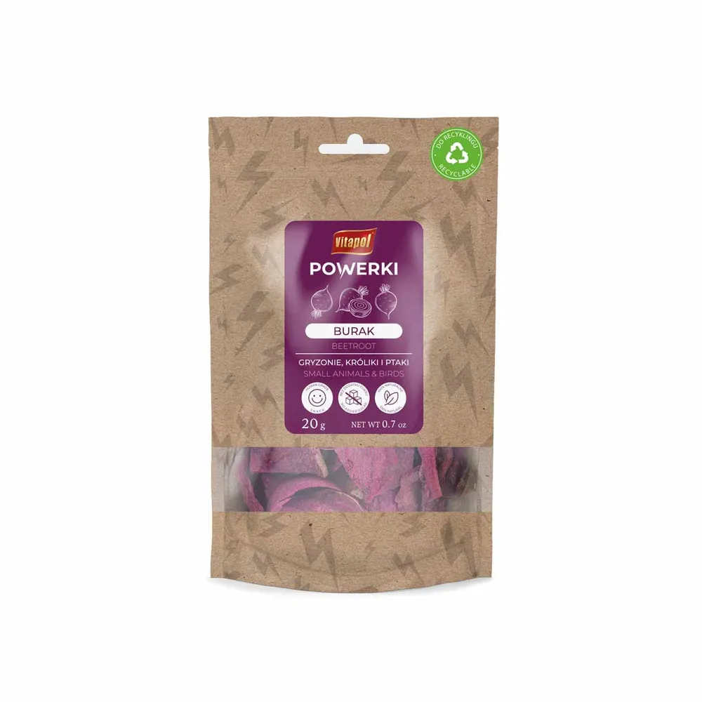 Frysetørret rødbede er en lækker, plantebaseret godbid fyldt med fibre, antioxidanter og naturlig sødme. Rødbede kan understøtte blodcirkulationen og immunforsvaret, samtidig med at den bidrager med variation i hundens snackrutine.