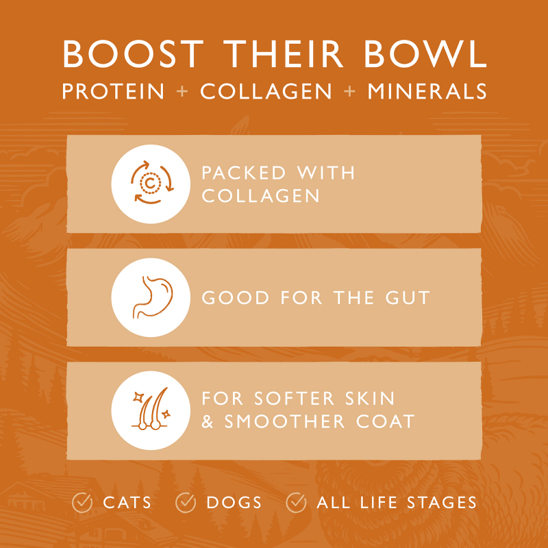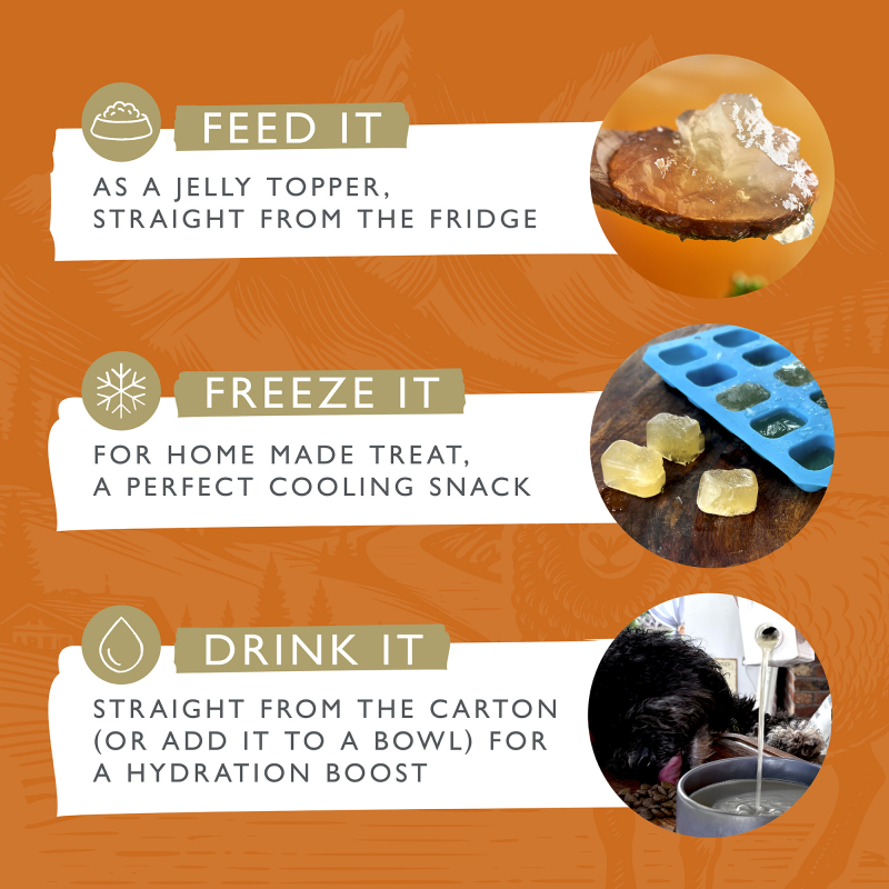 Bone Broth'en er yderst alsidig og kan bruges på flere måder. Hæld den over tørfoderet for ekstra smag og næring, servér den som en fugtgivende drik enten lun eller kold, eller frys den ned som en lækker og forfriskende isgodbid 🧊