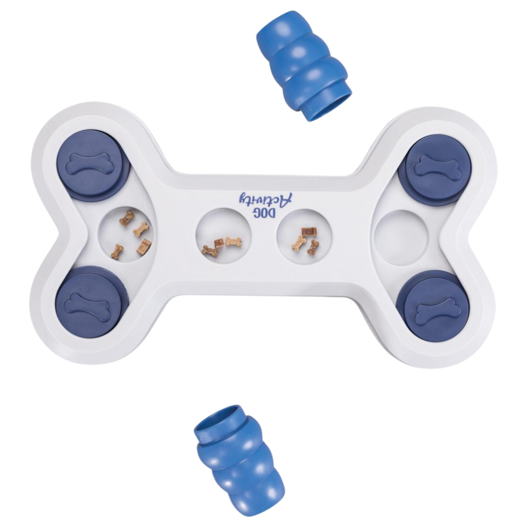 Niveau 1-hundespillet "Flip Bone" er en sjov aktivitet for vores små firbenede venner: Det består af forskellige fordybninger og skydelåg samt to kegler. Godbidder eller tørfoder er gemt i fordybningerne. Din hunds opgave er at få godbidderne ud med sin pote eller tryne.