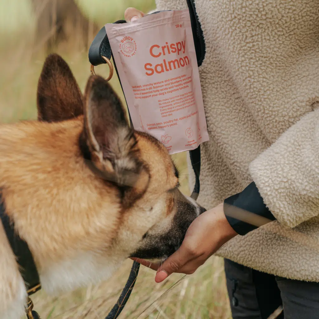 Buddy Crispy Vildfanget Laks & Blåbær Godbidder 150g – Sprøde, lækre hundetreats med naturlige ingredienser