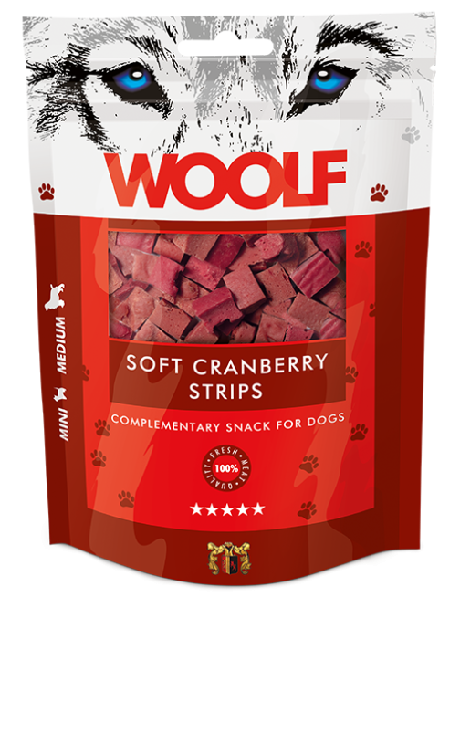 🐾 Woolf Soft Cranberry Strips – bløde snacks med kylling og tranebær