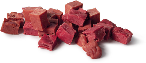 Røde tranebær 50%, kylling 40%, stivelse 5%, glycerin 4,9%, mineraler 0,1%