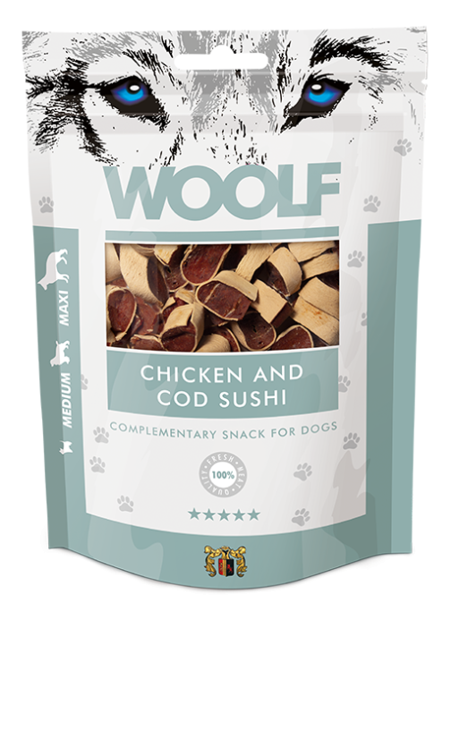 Woolf Chicken and Cod Sushi er velsmagende hundesnacks lavet af 100% proteinkilder. Med en kombination af kylling og torsk får din hund en sund, proteinrig og naturlig snack, der passer perfekt som belønning eller daglig forkælelse.