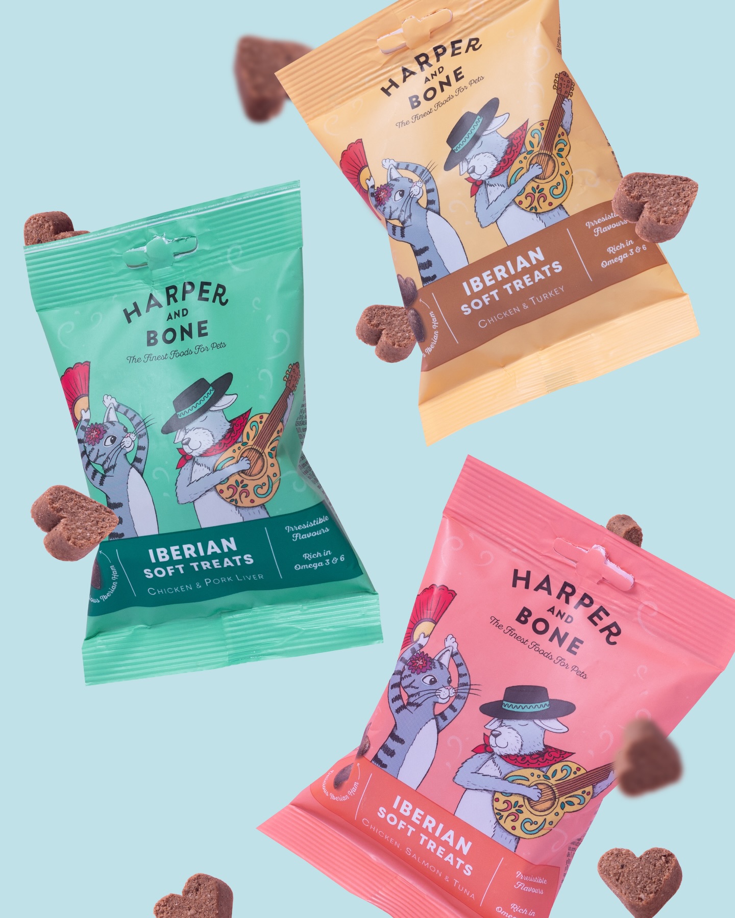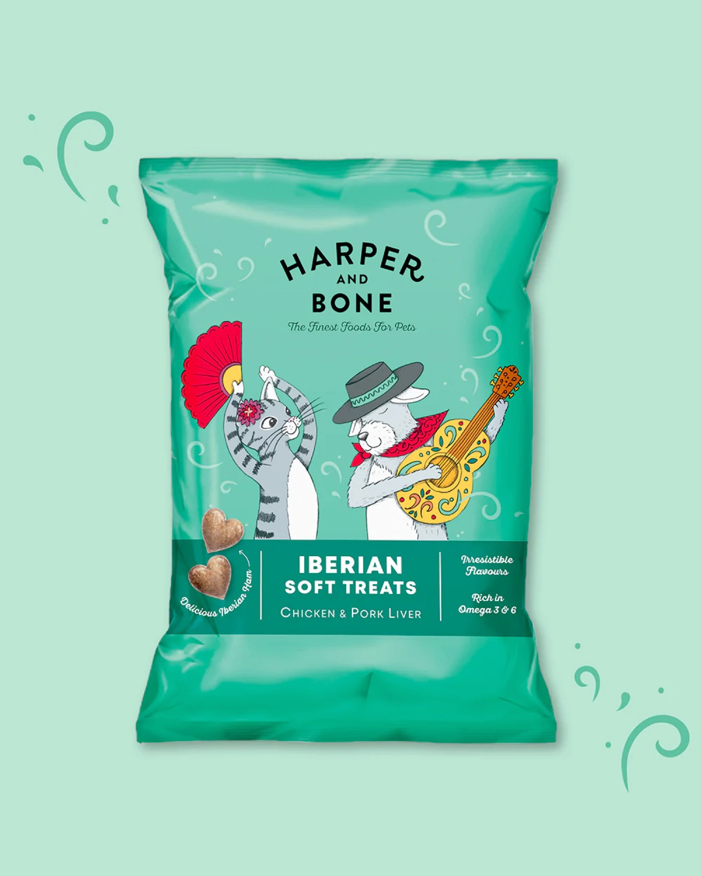 Harper & Bone Iberico Softies med kylling og gris er bløde godbidder udviklet med fokus på smag, kvalitet og nøje udvalgte råvarer. Opskriften kombinerer serrano skinke med kylling og svinelever og er inspireret af den spanske madtradition, hvor råvarernes naturlige smag er i centrum.