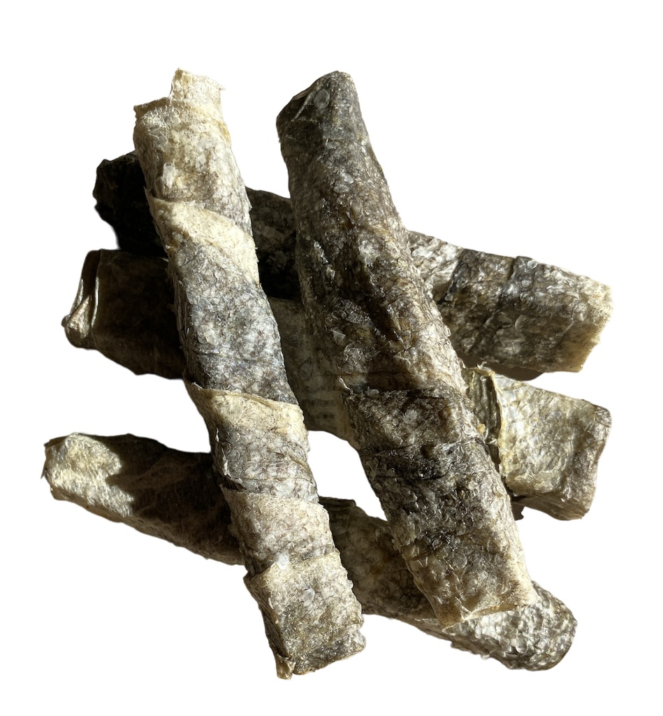 Sprød torskeskind med lækker torsekfyld - en super snack til den fiskeglade hund.