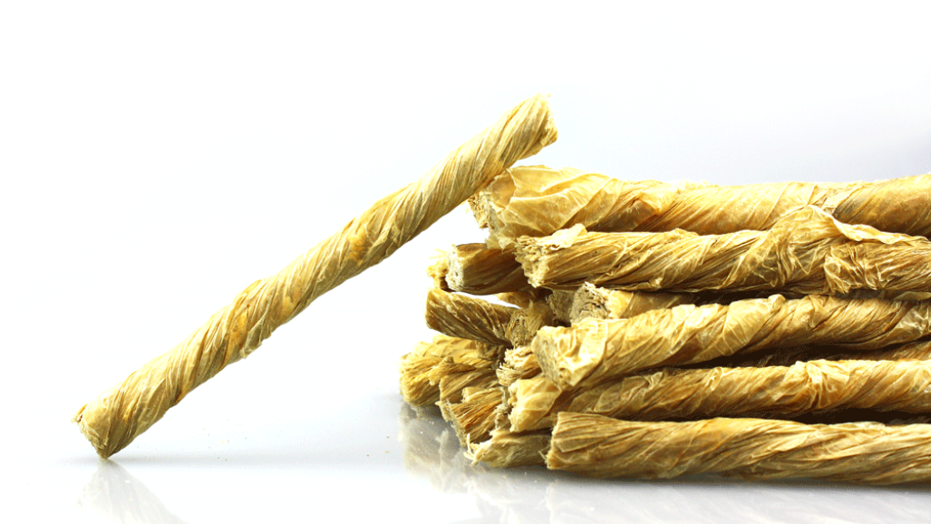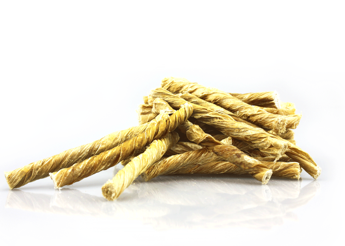 Disse helt naturlige kalveblærepinde er et magert, snoet hundegodbid, der især egner sig til hvalpe.