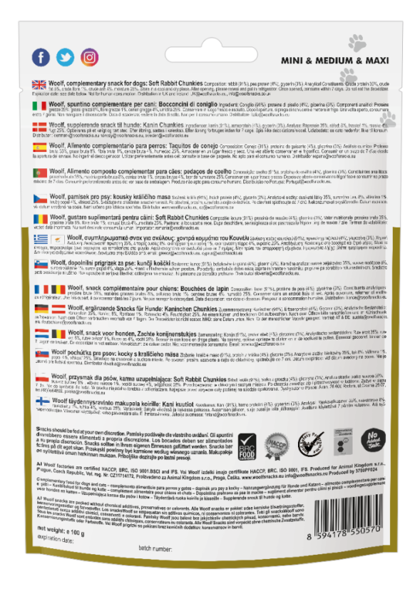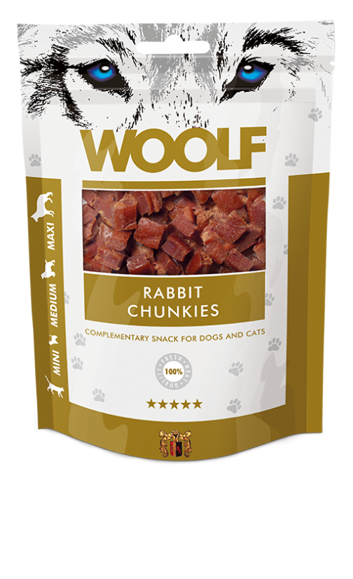 Woolf Rabbit Chunkies er små, lækre bidder lavet af 100% proteinkilder, sammensat af 91% kanin. De bløde tern er ideelle til mindre hunde, hvalpe fra 3 måneder samt katte, men kan nydes af hunde i alle størrelser.