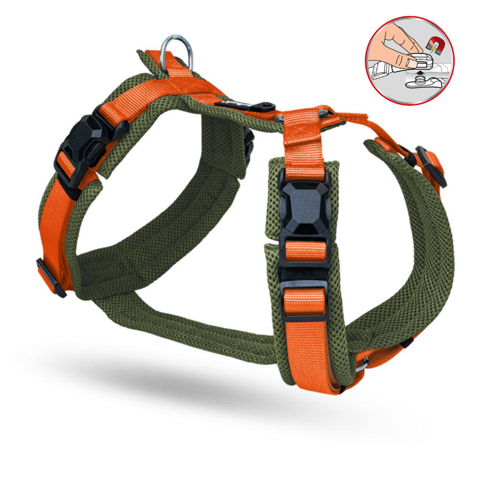 Selen er udstyret med magnetspænder ved både hals og bryst, som gør det utroligt nemt at tage selen på – helt uden at skulle trække den over hundens hoved. Perfekt til hunde, der ikke bryder sig om selen over hovedet – og en lettelse for dig! De er super stærke og du skal ikke bekymre dig om hvorvidt de holder selv til store hunde!