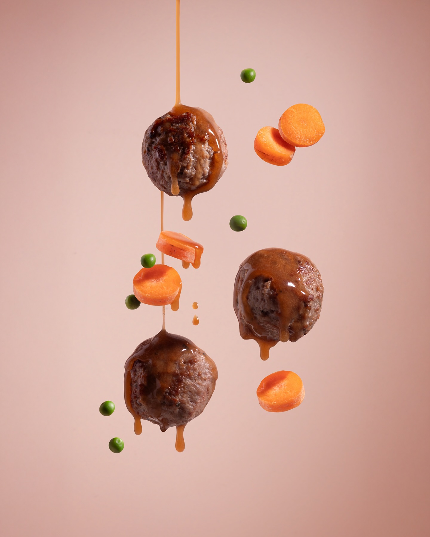 Måltidskødbollerne indeholder 60 % kød og fisk, herunder laks, hvid fisk, tun og sardiner kombineret med kylling, kalkun og gris. Den bløde og saftige konsistens gør dem velegnede som fuldfoder eller som et varierende supplement til tørfoder. De kan serveres direkte i skålen, bruges som topping eller anvendes i slikkemåtter og aktivitetslegetøj. Ved nedfrysning opnås længere beskæftigelse og mental stimulering.