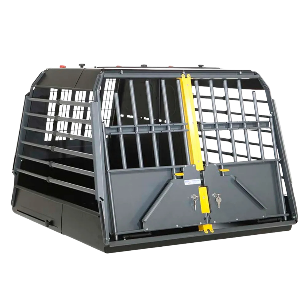 Buret er delvist fremstillet i aluminium, hvilket gør det lettere end mange andre bure i samme størrelse. Døren er hævet, så den åbner over bagagerummets kant.