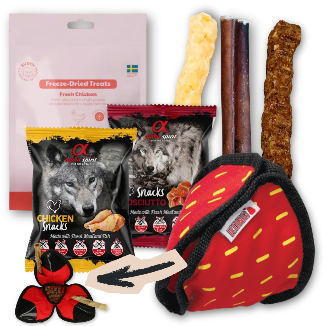 Elsker din hund at snuse, tygge og løse opgaver? Så vil denne pakke få halen til at logre! 6 håndplukkede produkter der kombinerer lækre snacks og mental stimulering, fyldt med smag, tekstur og hjerneaktivitet.
