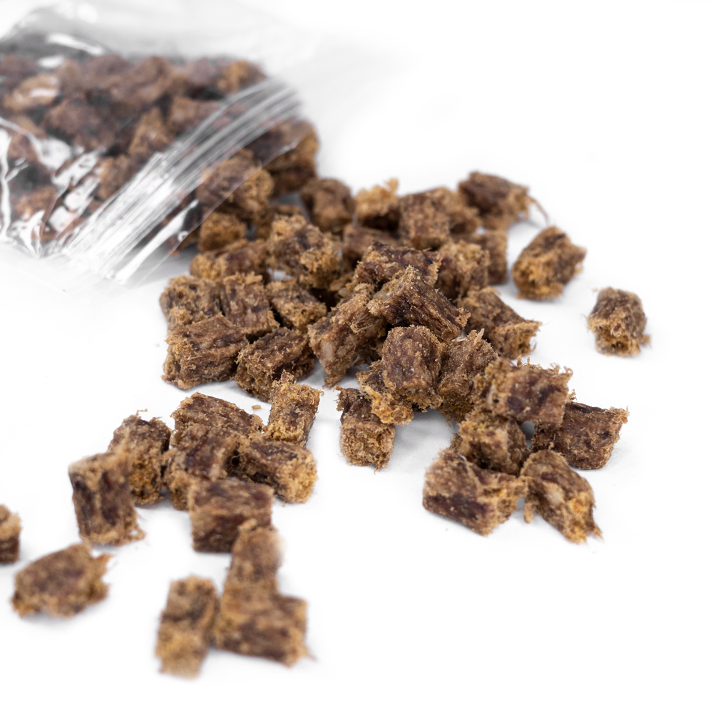 De er som alt andet hos os 100% naturlige. Den tørret men stadig bløde konsistens er perfekt når man træner så hunden ikke skal tygge for længe mellem komandoer.