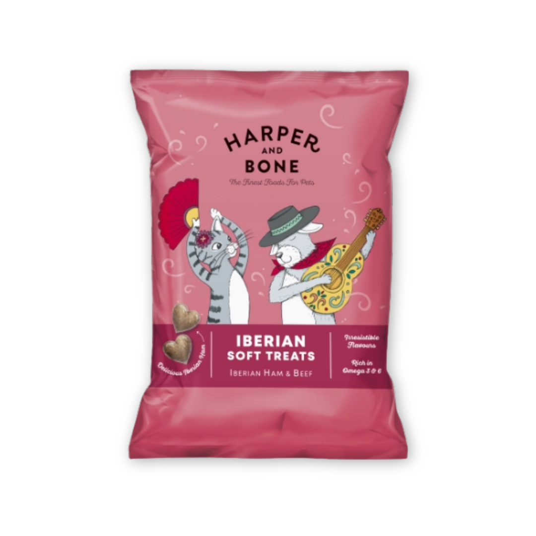 Harper & Bone Iberico Softies med okse er bløde godbidder udviklet med fokus på smag, kvalitet og nøje udvalgte råvarer. Opskriften kombinerer serrano skinke med oksekød og er inspireret af den spanske madtradition, hvor råvarernes naturlige smag er i centrum.