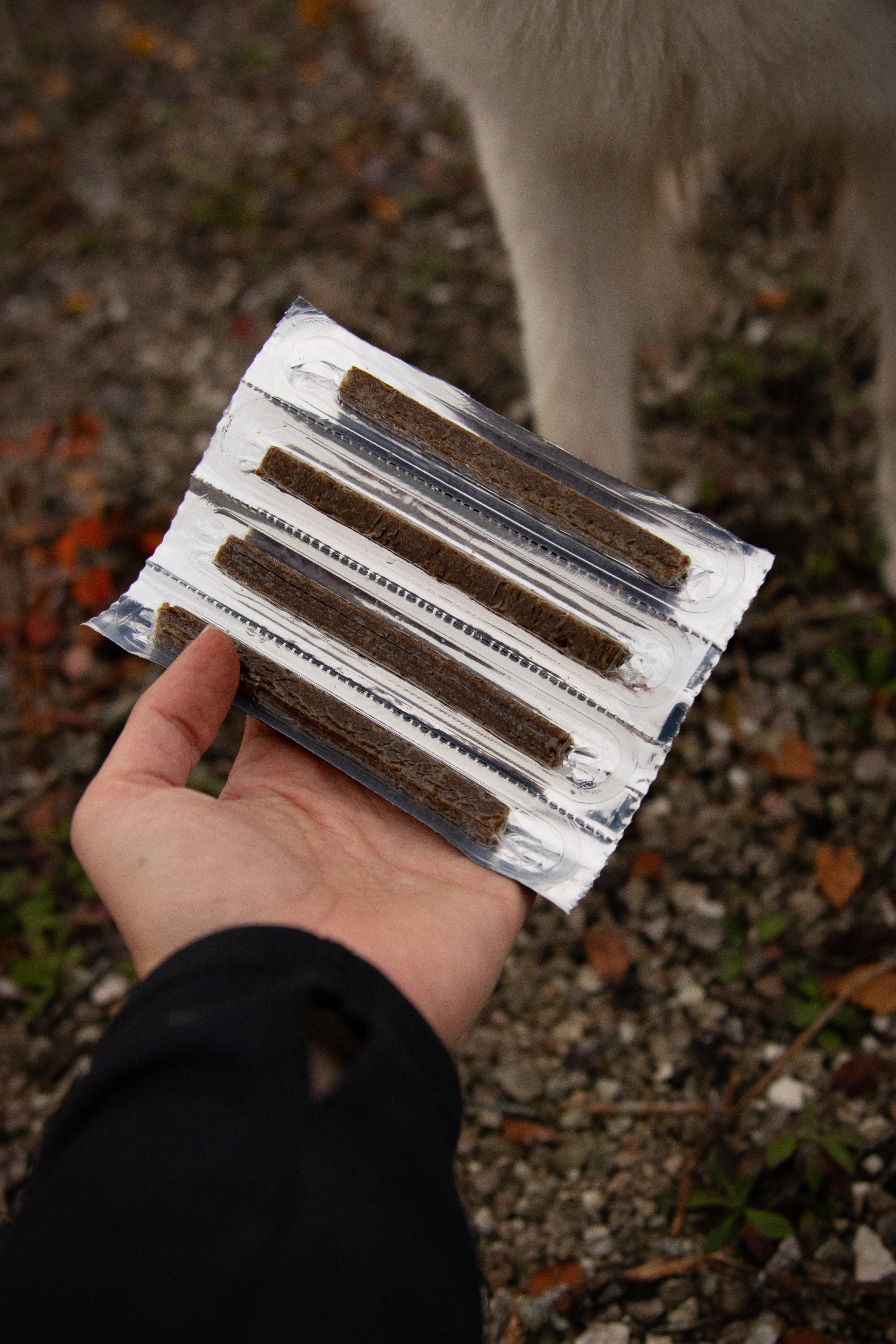 De 4 sticks (10 g hver) er individuelt pakket, hvilket gør dem nemme at tage med i godbids tasken til gåturen eller hundetræningen. Konsistensen er blød og duftende, en ideel hundesnack til både belønning, fokus og forkælelse i hverdagen 🐶