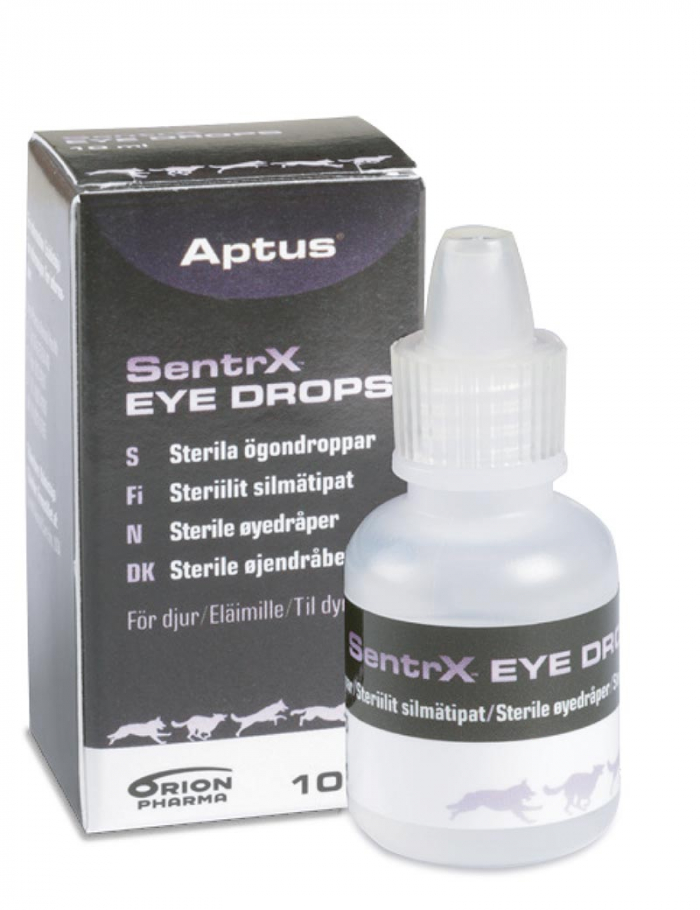 Aptus® SentrX Øjendråber er et avanceret tåresubstitut udviklet til at lindre og beskytte øjne hos både hunde og katte. Dråberne indeholder et patenteret biomateriale i form af kemisk modificeret og krydsbundet hyaluronsyre, som giver en intensiv og langvarig fugtbindende og smørende effekt.
