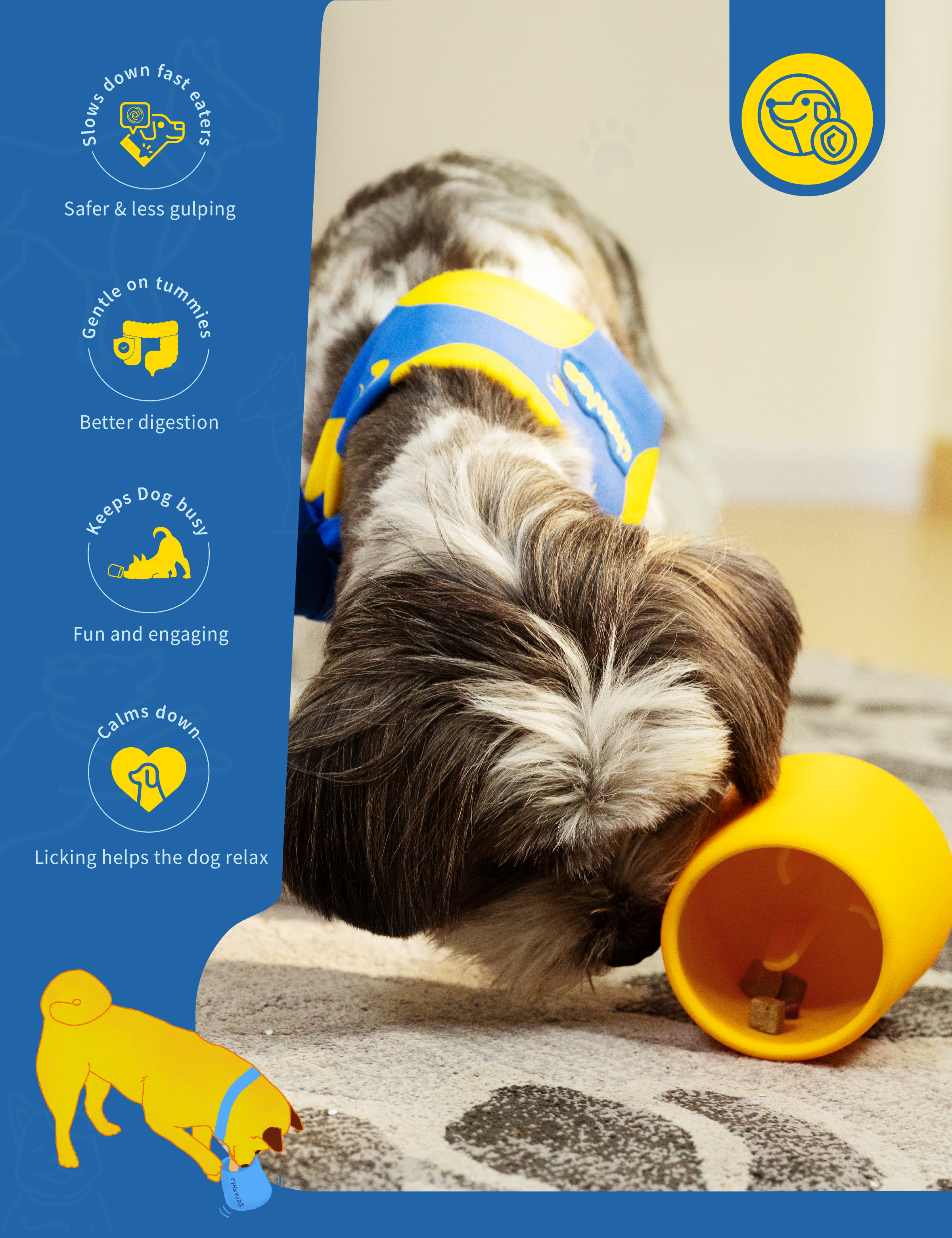 Topdelen fungerer som en slow-feeder, der reducerer spisetempoet og fremmer en bedre fordøjelse. Den fungere også perfekt til at fylde med vådfoder og fryse for ekstra udfordring.  Bunden kan anvendes som en slikkemåtte, der stimulerer sanserne og understøtter afslapning.