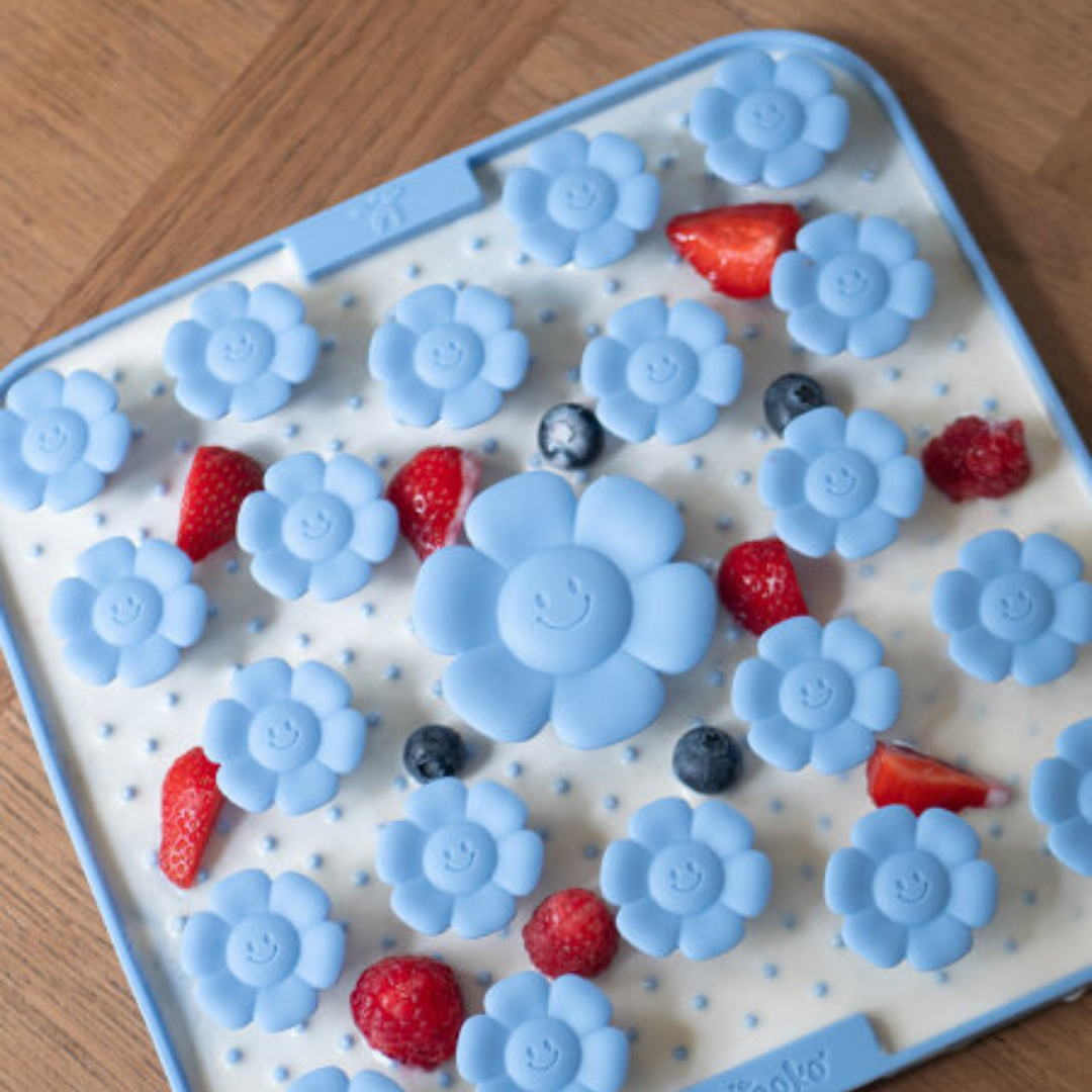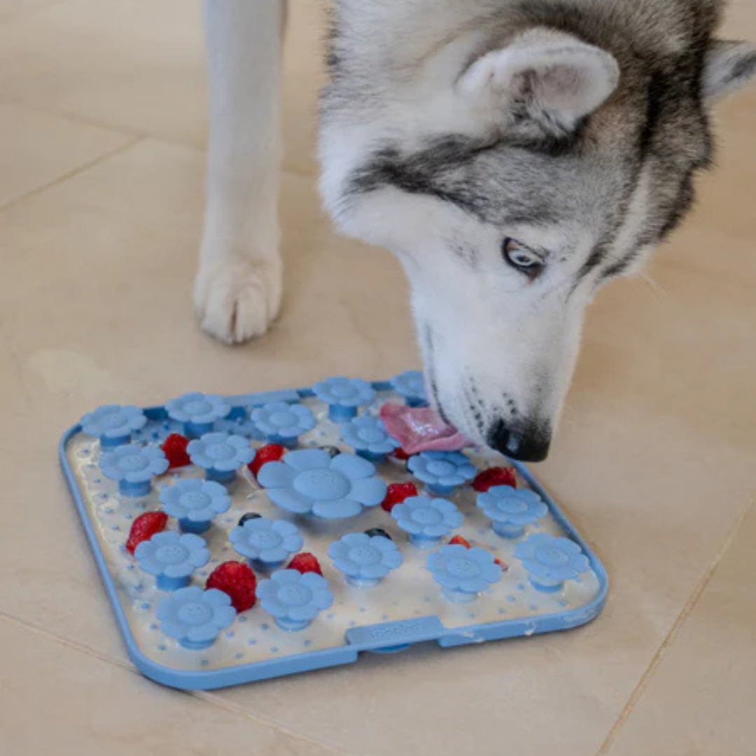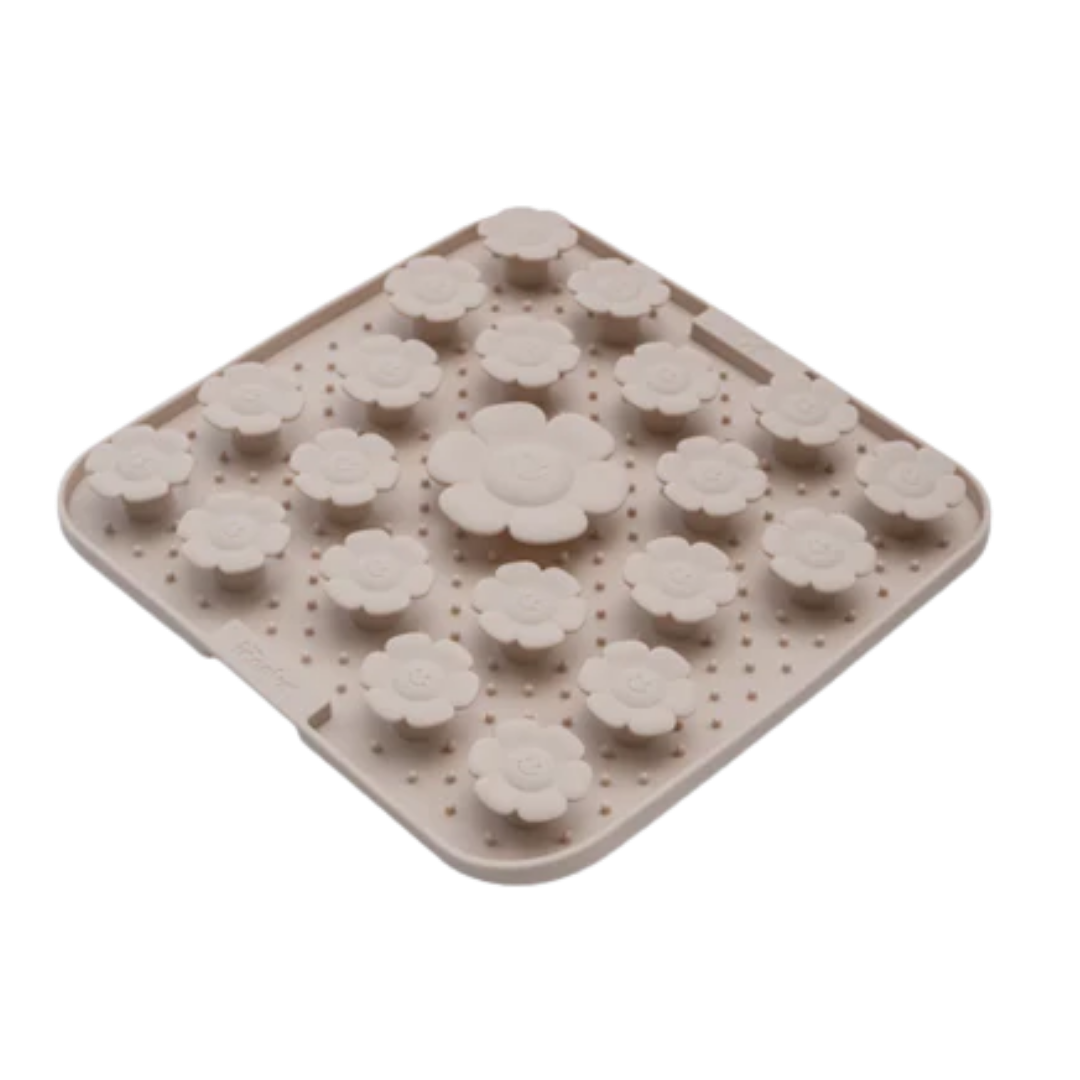 Du kan både gemme godbidder under de flotte blomster, smøre vådfoder og peanutbutter ud på måtten eller servere din hunds tørfoder derpå.
