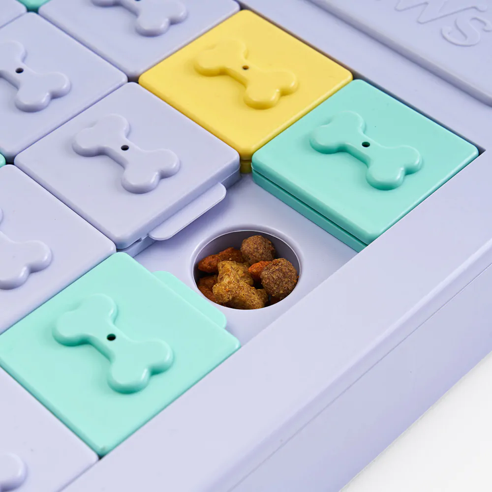 Legetøjet består af paneler med forhøjede ben-designs, som hunden skal skubbe til side for at finde de skjulte godbidder eller foderstykker. To af panelerne er stationære for at gøre legen ekstra udfordrende. Det er nemt at fylde op – træk blot bakken ud, fyld med godbidder eller tørfoder, og skub den tilbage. Den skridsikre bund sikrer, at spillet bliver på plads under legen.