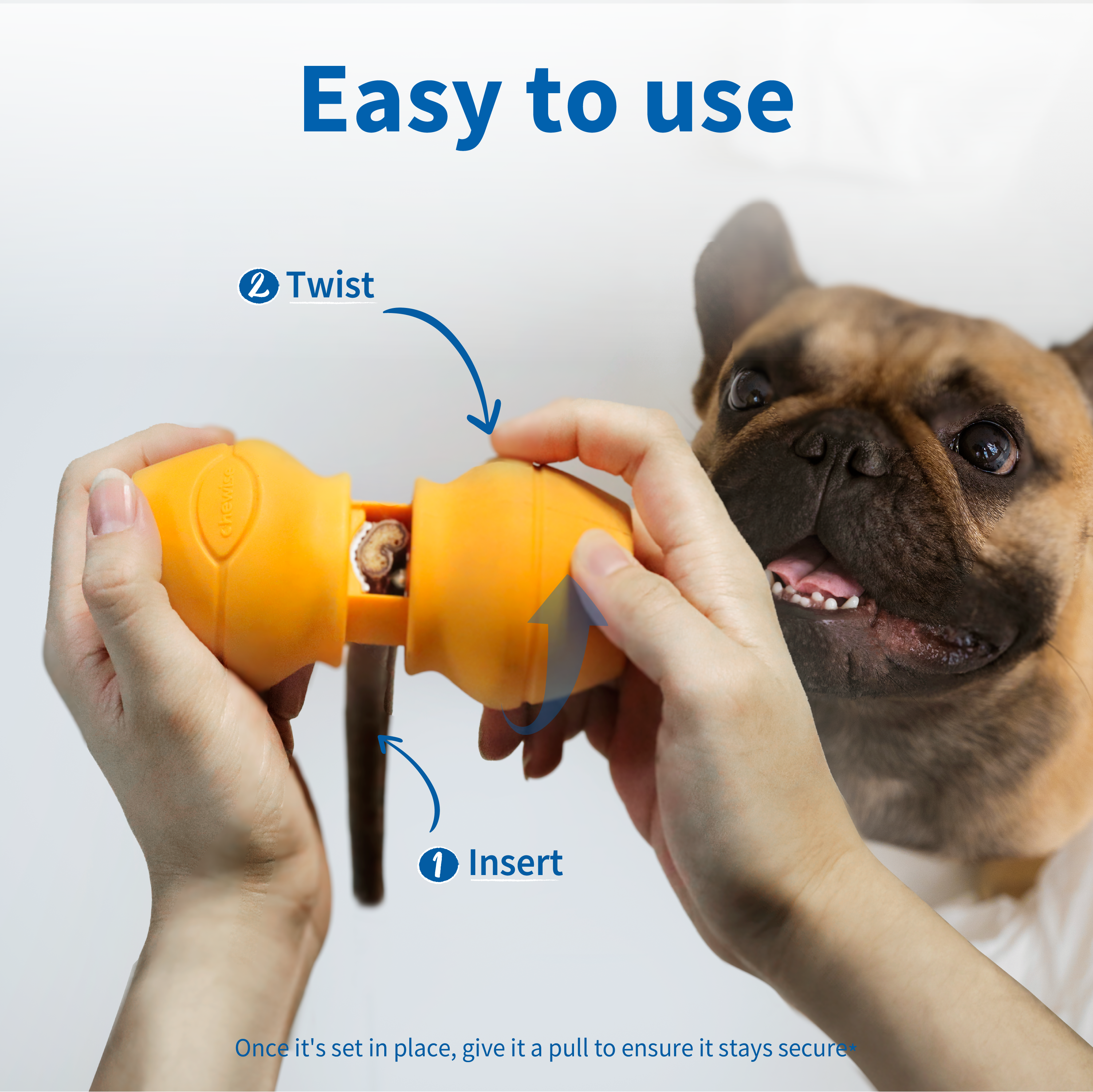 Indsæt din snack, drej til – færdig! Det selv-centrerende system gør det både nemt og sikkert at klargøre din hunds snack på få sekunder. Ingen fumlen, bare tyggeglæde!