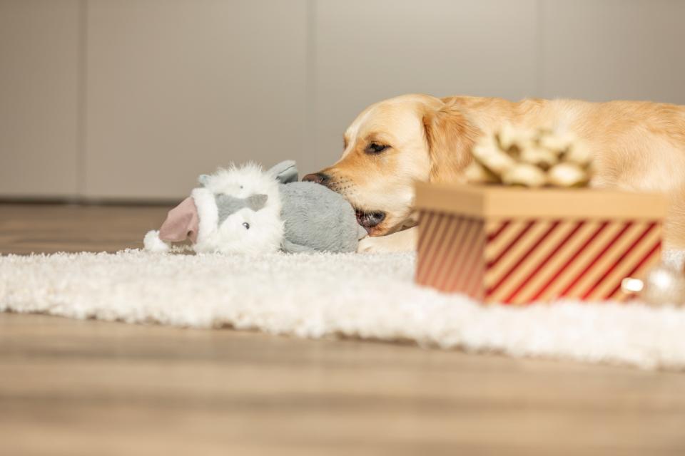 Festlig juleugle i blød plys og bomuld med indbygget lyd der gør legen ekstra sjov. Rebet giver et godt greb og gør legetøjet perfekt til både trække og kastelege.