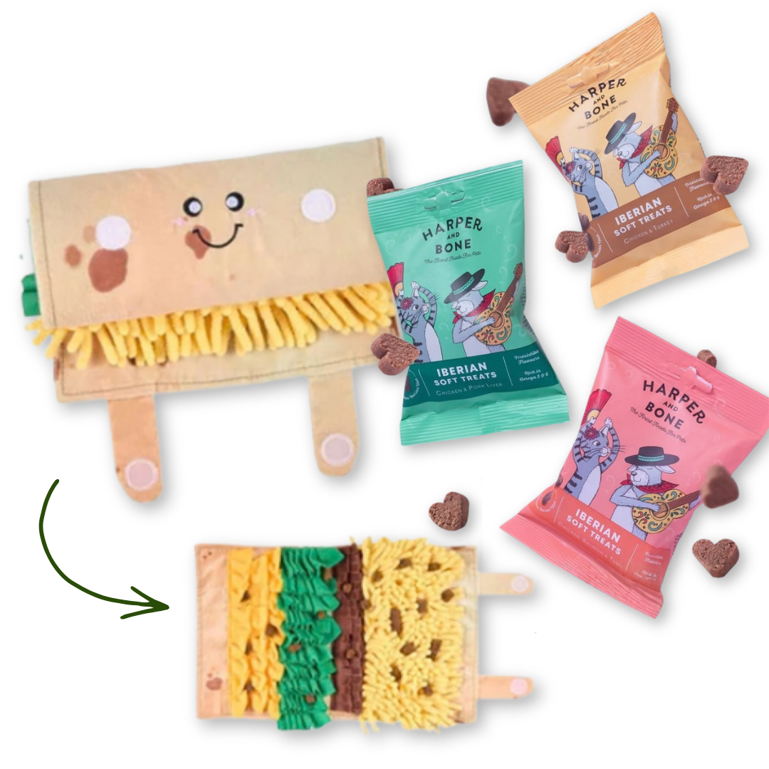VÆRDI 288,86 kr, snuseleg og smag i én pakke, få 1 af poserne Harper & Bone Iberico Softies GRATIS i pakken.